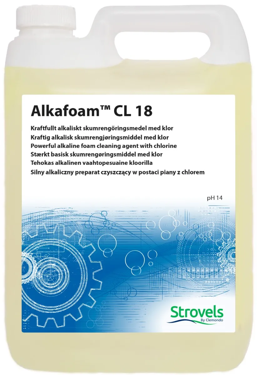 Alkafoam CL 18 är ett högalkaliskt skumrengöringsmedel med klor.Produkten löser mycket effektivt upp extremt fet smuts och inbrända proteiner i produktionslokaler och på inventarier.