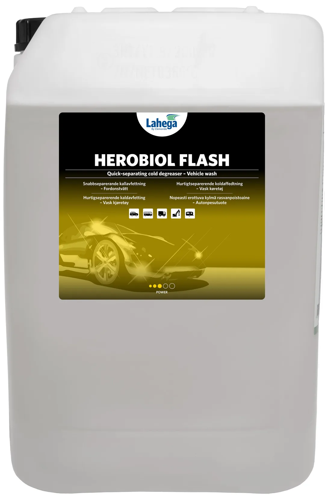 Herbiol Flash är ett snabbseparerande lågaromatiskt kallavfettningsmedel utan emulgator och med låg egenlukt. Det används vid borttagning av oljerik smuts, asfaltstänk, vägsalt m m på fordon och motorer och fungerar utmärkt som förtvättmedel i automattvättanläggningar. Herbiol Flash är användbart på våta ytor samt anpassat för nordiska vinterförhållanden. Produkten separerar extremt snabbt i oljeavskiljare.