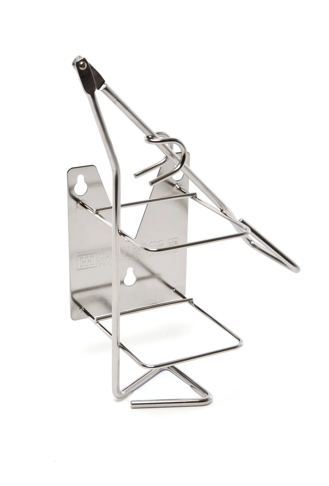 Rostfri armmanövrerad dispenserhållare avsedd för 600 ml flaskor. Vriden höger.